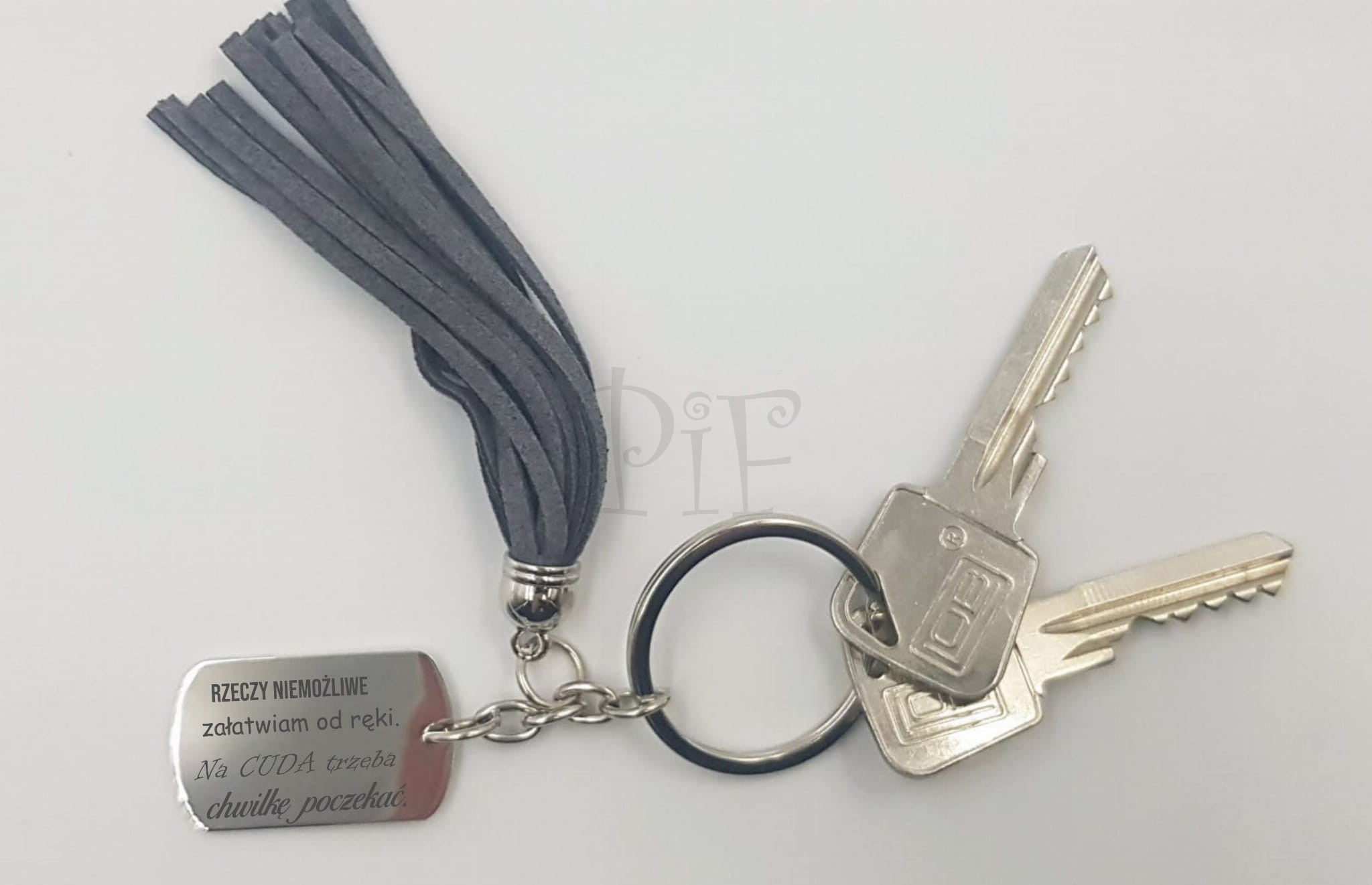 Breloczek z frędzlem grawerowany- Rzeczy niemożliwe załatwiam od ręki, na cuda trzeba chwilkę zaczekać