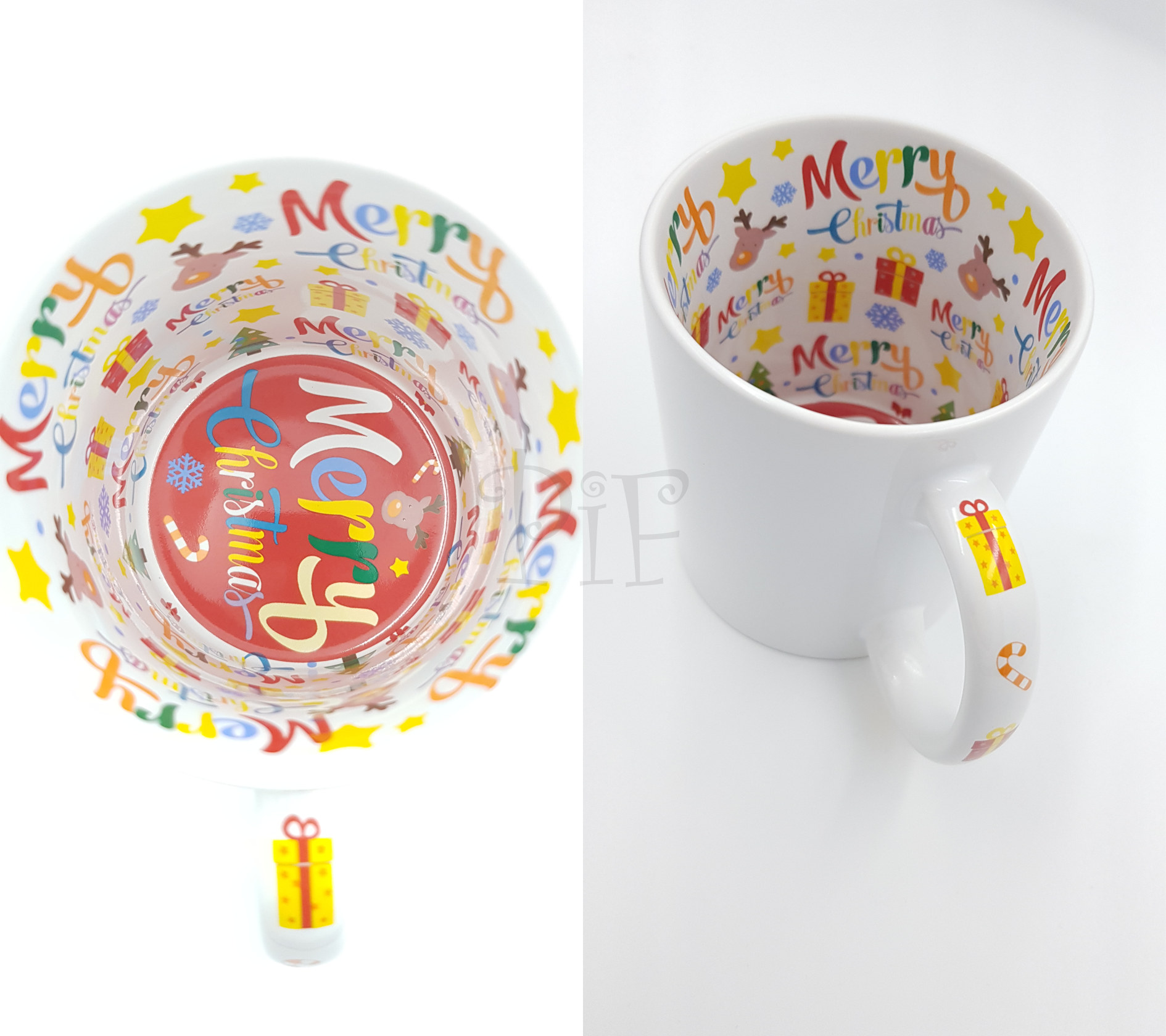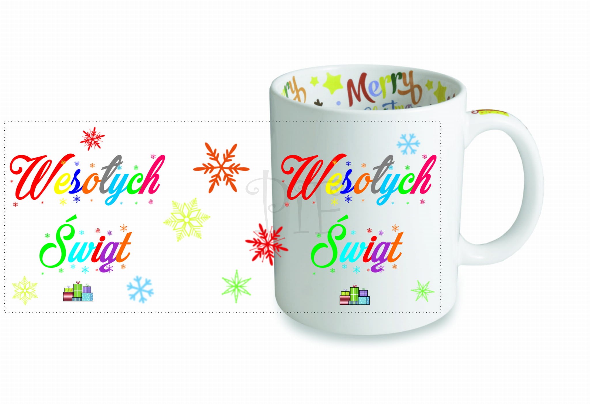 Kubek ceramiczny ze świątecznym nadrukiem wewnątrz, na uchu Merry Christmas oraz na zewnątrz Wesołych Świąt o pojemności 330ml.