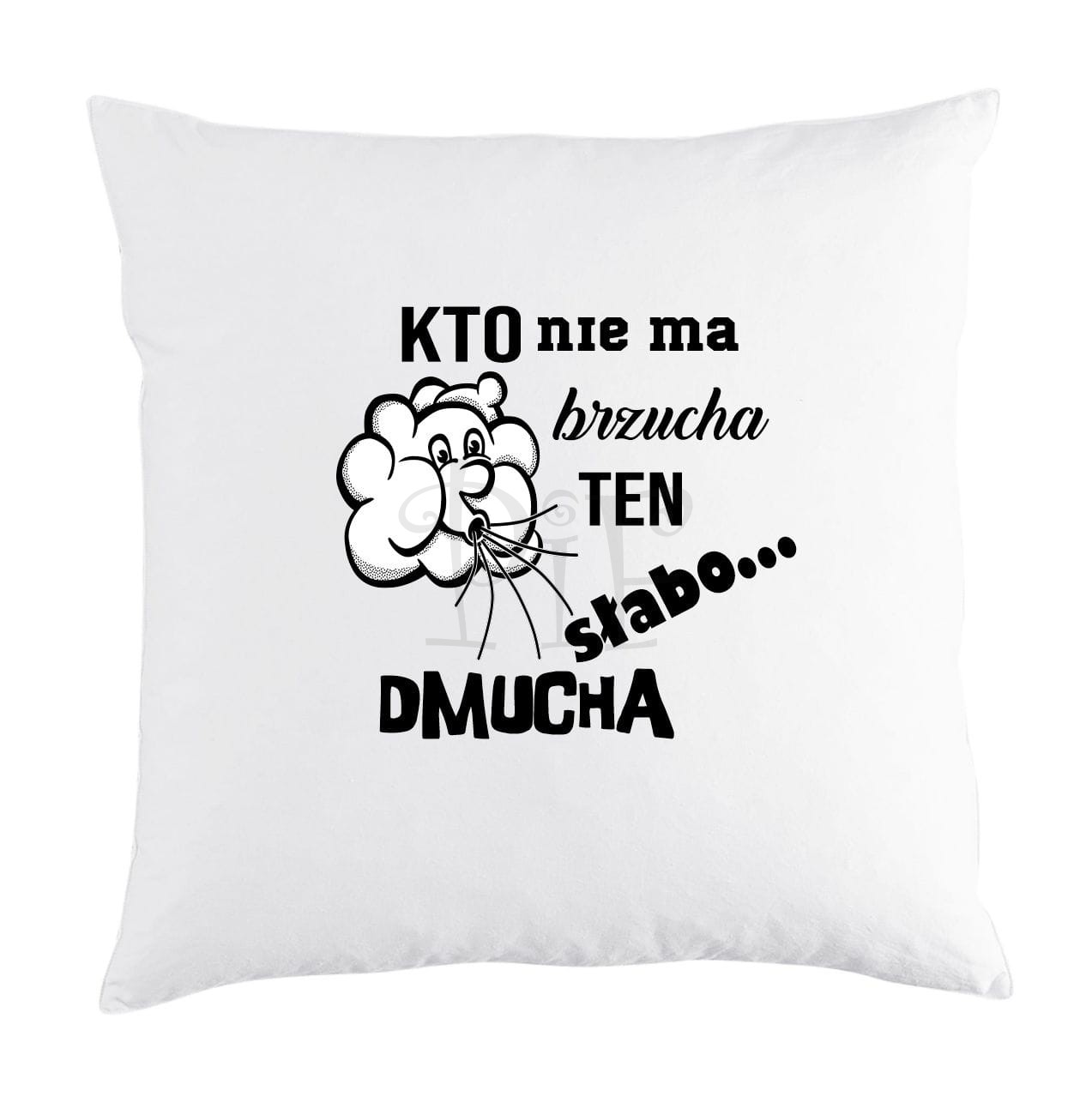 Poduszka ze śmiesznym napisem: Kto nie ma brzucha ten słabo dmucha