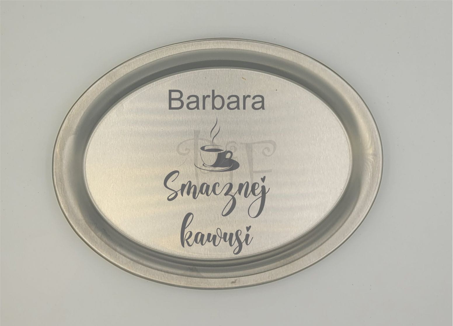 Taca metalowa z grawerem Smacznej kawusi + imię